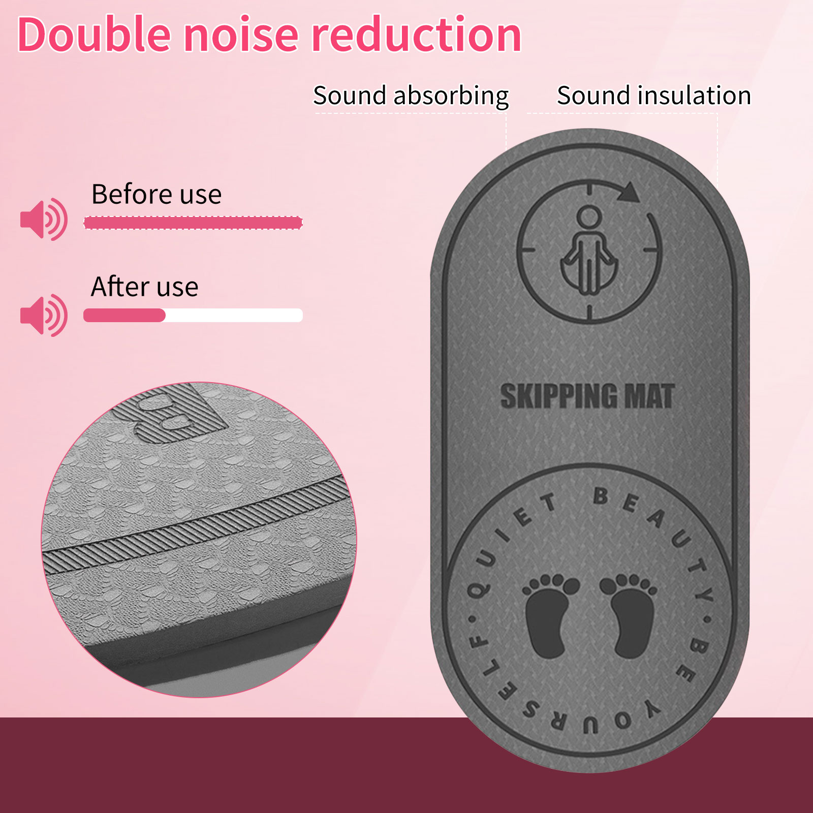 The anti-skid pattern of double-sided texture design can quickly and effectively drain the moisture on the contact surface and increase the friction. The front side is dedicated to prevent slippage of the human body, and the back side is dedicated to various floors for strong adsorption. It has excellent non-slip advantages and prevents injuries. You can choose this rope skipping mat boldly and safely.