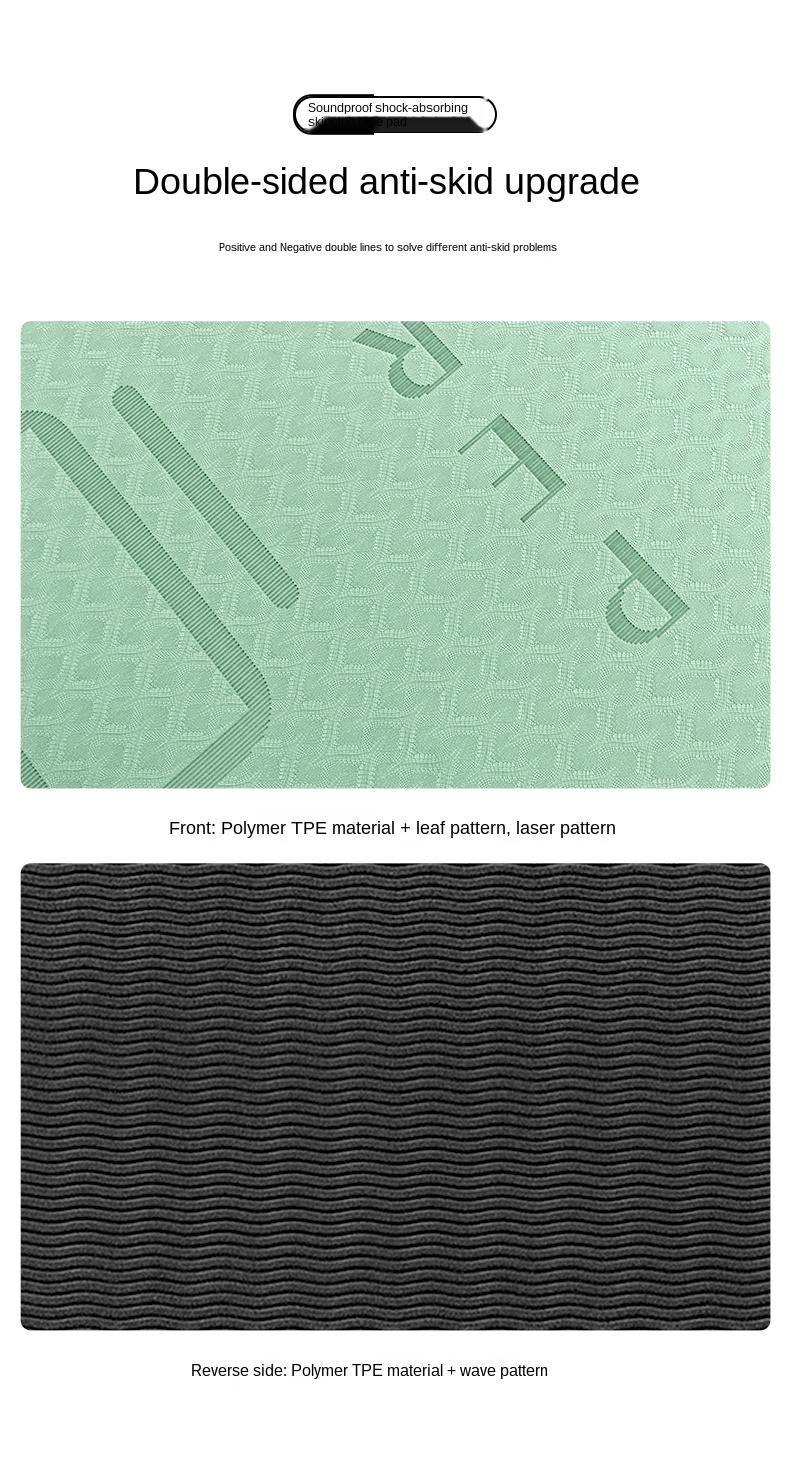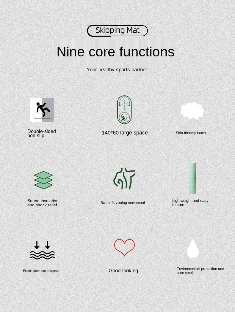 Item:Skipping mat Color: gray/pink/green Size:140X60cm(Please allow 1-3cm error due to manual measurement) Thickness: 6mm Material:TPE Users:Women/Men/Children Features:Easy clean/High quality/Applicable for all age group