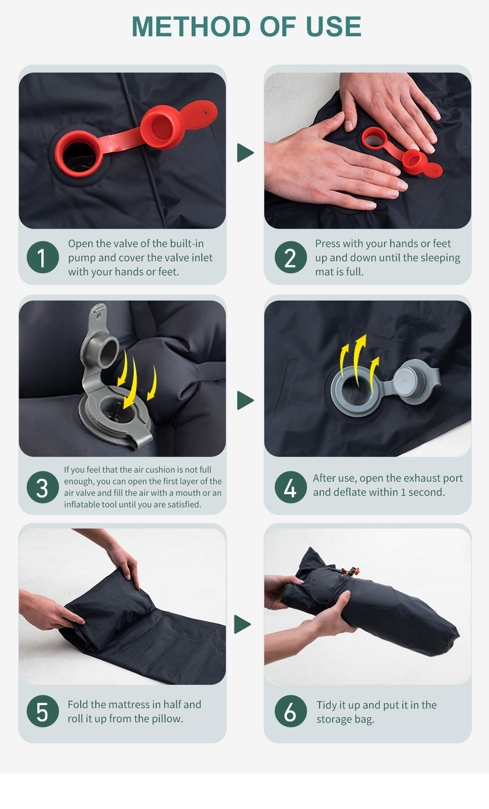 5.Comfortable and Reliable:Comfort and no leak is the priority,with air-support cells design to limit air movement and heat loss.The cubed surface design fits the body’s natural curves,whether you sleep on this on your back,sides or stomach,you can always feel comfortable. The specially designed Two Way Valve prevent the air leak,so there’s no worry about get up and inflate it in the middle of the night, just have a good sleep.