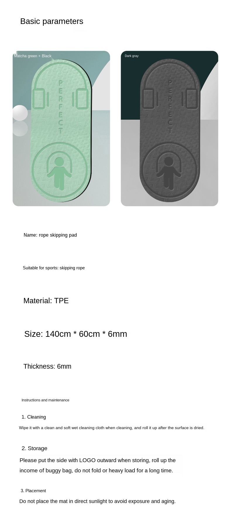 Item:Skipping mat Color: gray/pink/green Size:140X60cm(Please allow 1-3cm error due to manual measurement) Thickness: 6mm Material:TPE Users:Women/Men/Children Features:Easy clean/High quality/Applicable for all age group